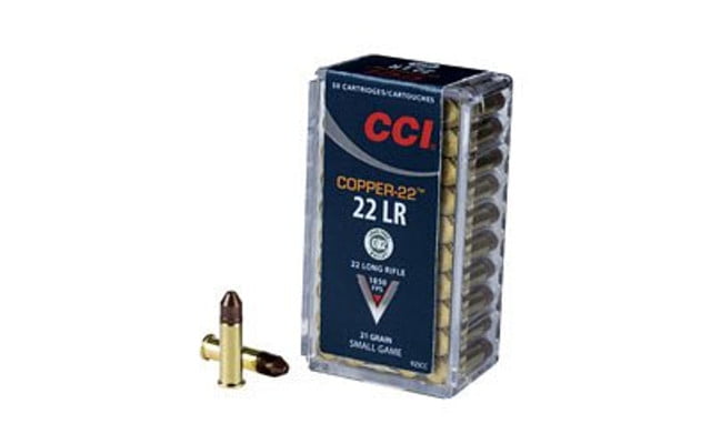 The Copper-22 has accurate, reliable performance on targets and small game in a non-lead bullet. The projectile is constructed from a unique mix of copper particles and polymer compressed into a potent, hollow-point bullet. It ulizies CCIs reliable priming and propellant and provide superb accuracy.