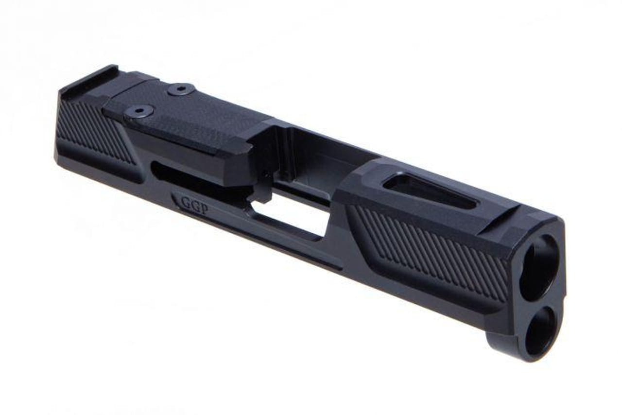 The GGP365 stripped slide is constructed of 17-4 stainless steel and comes cut compatible with the Shield RMS-C or SIG ROMEOZero micro red dot optics, with an attractive G10 coverplate for when a MRDS is not in use. This version 2 features a recessed area with fine serrations in front and rear.