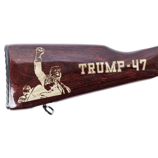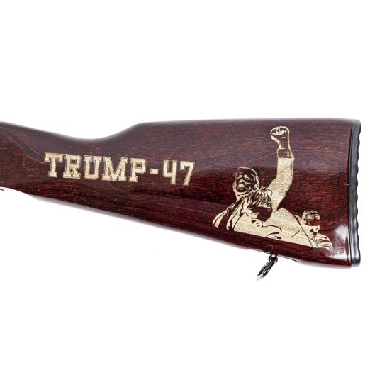 The barrel is a proprietary blend of hammer-forged chrome-moly vanadium made by FN that is referred to as “Machine Gun Steel” by virtue of its use in FN’s M249 and M240 weapons. The hammer forging process work hardens the steel, making it more durable. This 16″ barrel is magnetic particle inspected, to ensure quality and dependability and is pressed into a hammer forged 4340 AQ front trunnion to ensure the longevity AK-47’s are known for. The hardened steel 1mm receiver features a TiN-coated PSA EPT Fire Control Group and a side rail mount. The carrier is hammer forged and TiN coated. The front trunnion is engraved with GF5 to designate the new GF5 hammer-forged model. The rifle is finished with a classic Plum Gloss handguard, “Trump-47” engraved stock, and grip. This rifle ships with a 30 round magazine with engraved Seal of the President of the United States (where allowed by law).
